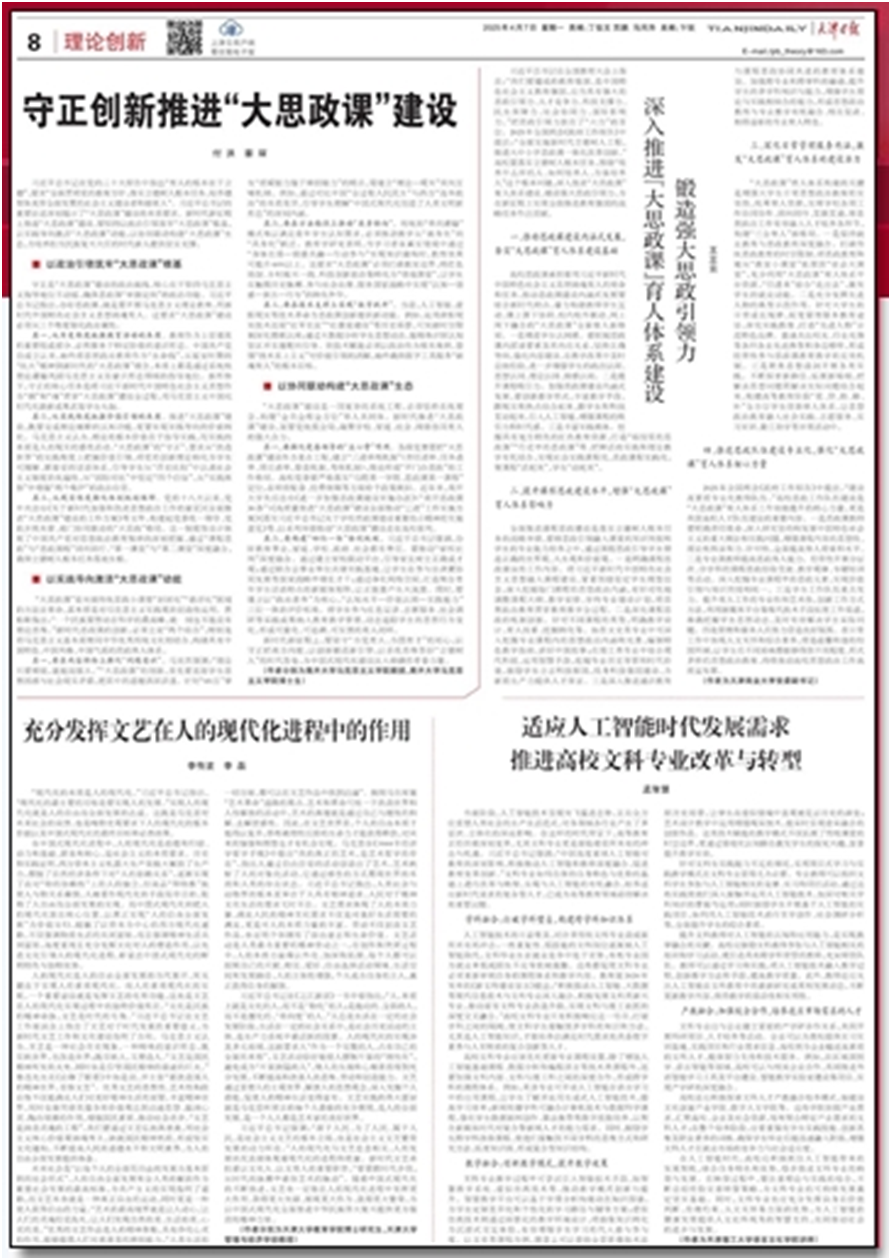 4月7日,《天津日报》(理论创新版)刊发星空党委副书记王立云理论文章《深入推进“大思政课”育人体系建设 锻造强大思政引领力》。文章指出,高校要落实立德树人根本任务,围绕“培养什么样的人、如何培养人、为谁培养人”这个根本问题,深入推进“大思政课”育人体系建设,锻造强大思政引领力,为在新征程上实现全面推进教育强国的战略任务作出贡献。