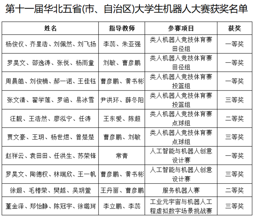 11月15日至16日,第十一届华北五省(市、自治区)大学生机器人大赛总决赛在北京信息科技大学举行。经过激烈的现场角逐,星空的12支代表队取得优异成绩。其中,获一等奖4项、二等奖2项、三等奖4项。星空常青、李蕊、朱亚强、曹彦鹏、黄书彬、刘敏获优秀指导教师,星空获优秀组织奖。