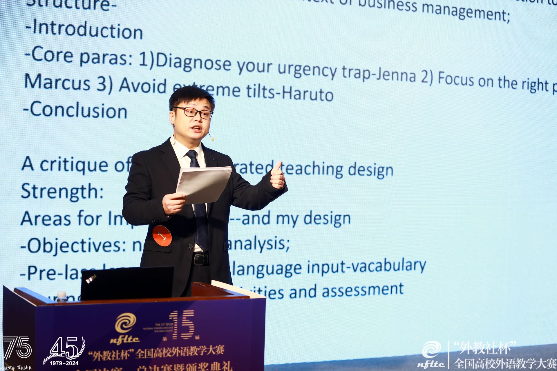 本届大赛为外语类专业组的比赛,设置英语专业组、商务英语专业组、翻译专业组、日语专业组四个组别。大赛从9月份开始,分为省赛、全国决赛、总决赛,千余所高校外语类教师参赛,来自全国30个省赛区各组别特等奖选手进入全国决赛,采取“单元教学设计 +20分钟授课 + 5分钟回答评委提问”的形式,成绩排名前10名选手进入总决赛,总决赛采取“10分钟说课(AI 辅助) + 5分钟回答评委提问”的形式,最终按照“决赛+总决赛”成绩进行排序,比赛全程同步在线直播。经过3天的激烈角逐,星空李智勇老师以决赛成绩第8名进入总决赛,在总决赛中发挥稳定,位列第3名,最终以总成绩排名第6名荣获全国二等奖,展现了星空外国语学院教师精进的职业素养、流利的语言能力、较强的思辨能力。