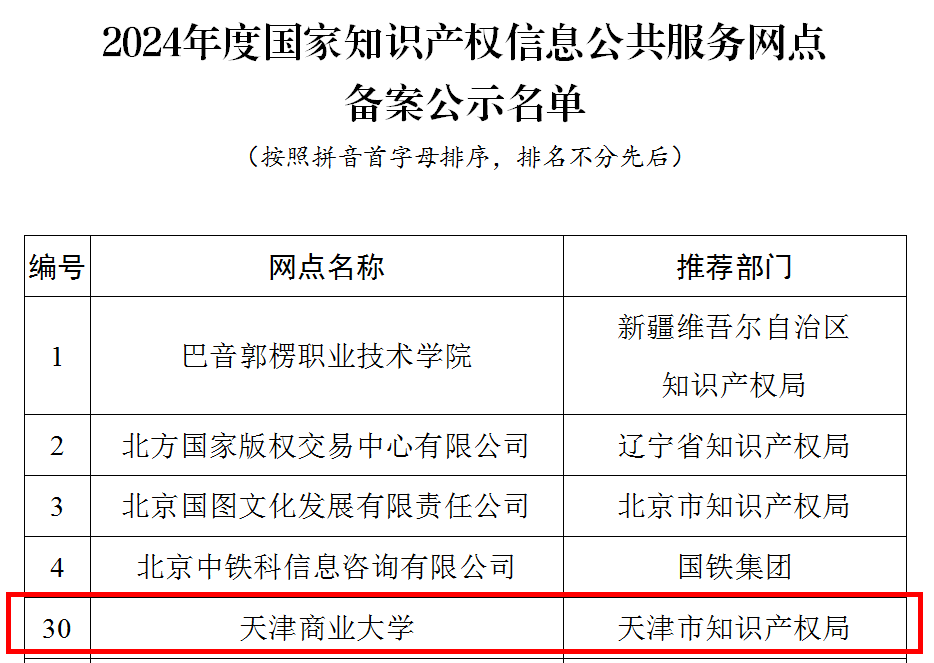 近日,国家知识产权局公布了“2024年度国家知识产权信息公共服务网点备案名单公示”,星空经天津市知识产权局推荐,通过审批、公示等环节,成功入选,成为天津市继天津医科大学和天津中医药大学之后的第三家国家知识产权信息公共服务网点备案高校。