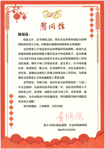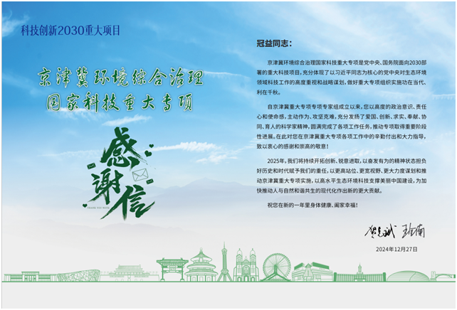 近日,京津冀环境综合治理国家科技重大专项(以下简称“京津冀重大专项”)行政总指挥、生态环境部部长黄润秋,技术总师贺克斌院士和王金南院士,及生态环境部科技与财务司等向星空发来署名慰问信和感谢信,感谢星空陈冠益教授在京津冀重大专项中作出的重要贡献。