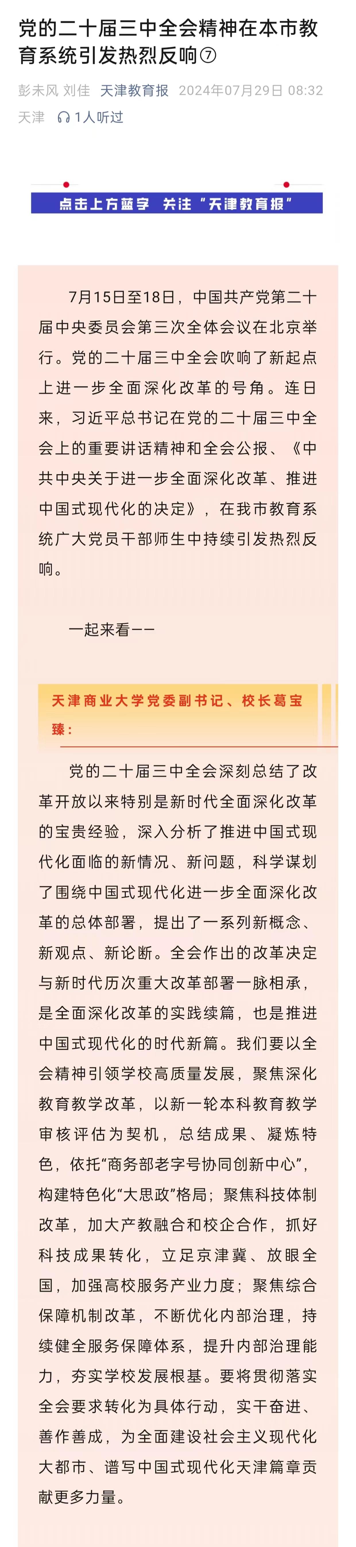 党的二十届三中全会深刻总结了改革开放以来特别是新时代全面深化改革的宝贵经验,深入分析了推进中国式现代化面临的新情况、新问题,科学谋划了围绕中国式现代化进一步全面深化改革的总体部署,提出了一系列新概念、新观点、新论断。全会作出的改革决定与新时代历次重大改革部署一脉相承,是全面深化改革的实践续篇,也是推进中国式现代化的时代新篇。我们要以全会精神引领学校高质量发展,聚焦深化教育教学改革,以新一轮本科教育教学审核评估为契机,总结成果、凝炼特色,依托“商务部老字号协同创新中心”,构建特色化“大思政”格局;聚焦科技体制改革,加大产教融合和校企合作,抓好科技成果转化,立足京津冀、放眼全国,加强高校服务产业力度;聚焦综合保障机制改革,不断优化内部治理,持续健全服务保障体系,提升内部治理能力,夯实学校发展根基。要将贯彻落实全会要求转化为具体行动,实干奋进、善作善成,为全面建设社会主义现代化大都市、谱写中国式现代化天津篇章贡献更多力量。