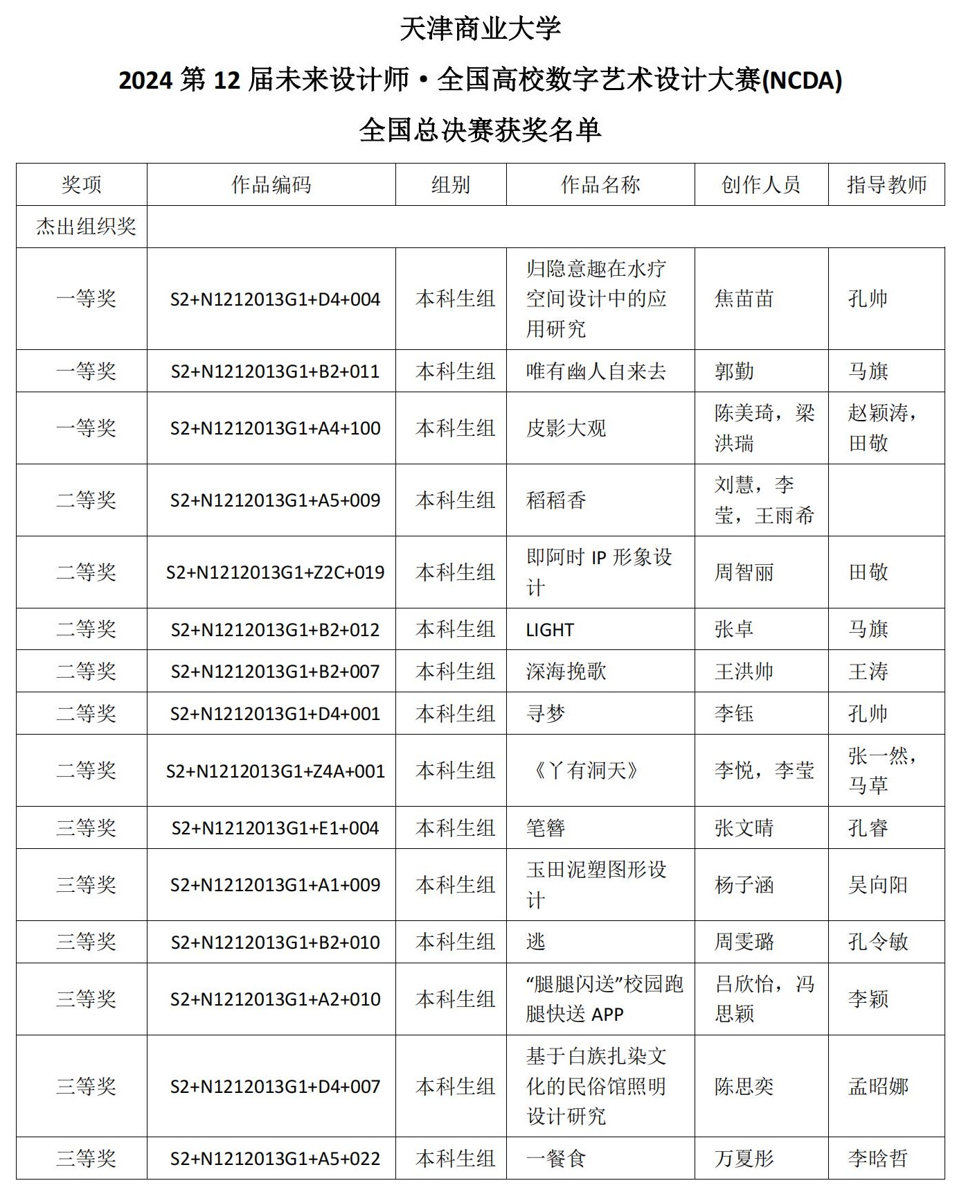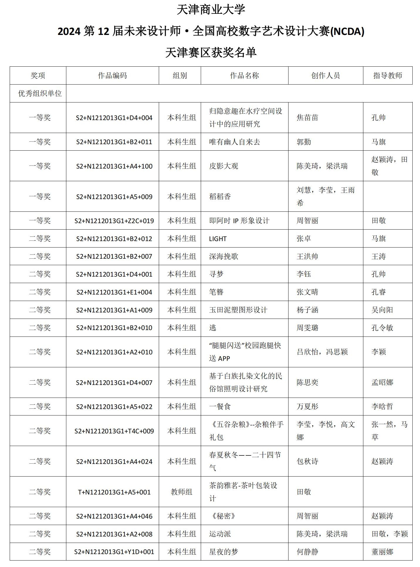 近日,2024年第十二届未来设计师·全国高校数字艺术设计大赛(NCDA)获奖名单公布,星空艺术学院学生获全国总决赛一等奖3项、二等奖6项、三等奖6项,获天津赛区一等奖5项、二等奖15项、三等奖19项;学校荣获全国总决赛“杰出组织奖”,天津赛区“优秀组织奖”。