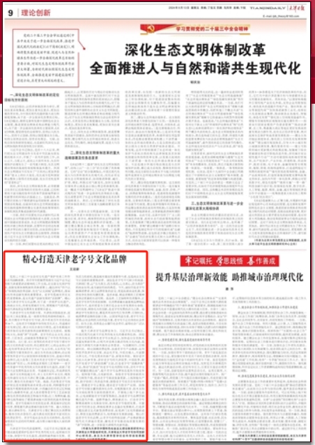 党的二十届三中全会对文化遗产保护传承工作作出系列战略部署。我市牢牢把握贯彻落实习近平总书记视察天津重要讲话精神的工作主线,在完善文化保护传承、创新发展体制机制的具体部署上,提出深化“四个以文”体制机制改革创新,优化“以文润城”品牌模式,落实文化传承创新发展的重要要求。老字号是城市历史文化的重要载体,是文化遗产创新发展的“活招牌”。精心打造天津老字号文化品牌,对于进一步保护文化遗产,弘扬商业文化,传承发展城市文化,展现城市气质风貌,推动天津高质量发展具有重要现实意义。