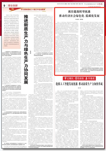 9月20日,《天津日报》(理论创新版)刊发星空经济学院孙云鹏副教授、副校长陈冠益教授理论文章《抓住能源转型机遇 推动经济社会绿色化、低碳化发展》。文章指出,要加快实现生产生活方式绿色变革,推动经济社会发展建立在资源高效利用和绿色低碳发展的基础之上。积极稳妥推进碳达峰碳中和,需要不断加快推进能源消费方式变革,不断探索规划建设新型能源体系。