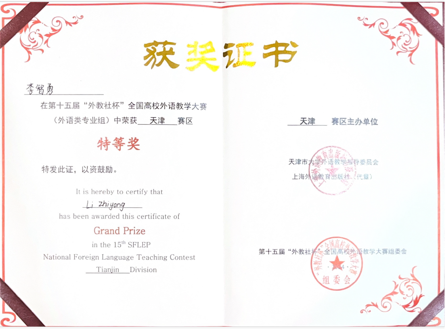 “外教社杯”全国高校外语教学大赛是我国外语教育界的一项重要赛事,旨在推动高校外语教学改革,提高外语教学质量。本次比赛吸引了来自天津市各高校的众多优秀外语教师参加,分为复赛和决赛。李智勇老师在比赛中展现了扎实的语言功底、丰富的教学经验和创新的教学方法。他的教学展示精彩纷呈,问答环节紧扣主题,口语流畅,赢得了评委和观众的一致好评。