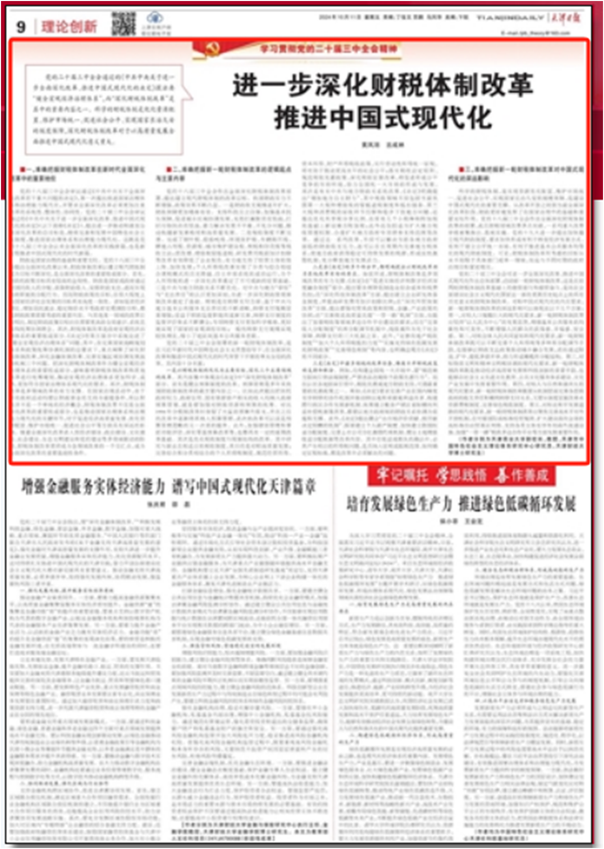 10月11日,《天津日报》(理论创新版)刊发星空副校长黄凤羽理论文章《进一步深化财税体制改革 推进中国式现代化》。文章指出,党的二十届三中全会通过的《中共中央关于进一步全面深化改革、推进中国式现代化的决定》提出要“健全宏观经济治理体系”,而“深化财税体制改革”是其中的重要内容之一。科学的财税体制是优化资源配置、维护市场统一、促进社会公平、实现国家长治久安的制度保障,深化财税体制改革对于以高质量发展全面推进中国式现代化意义重大。