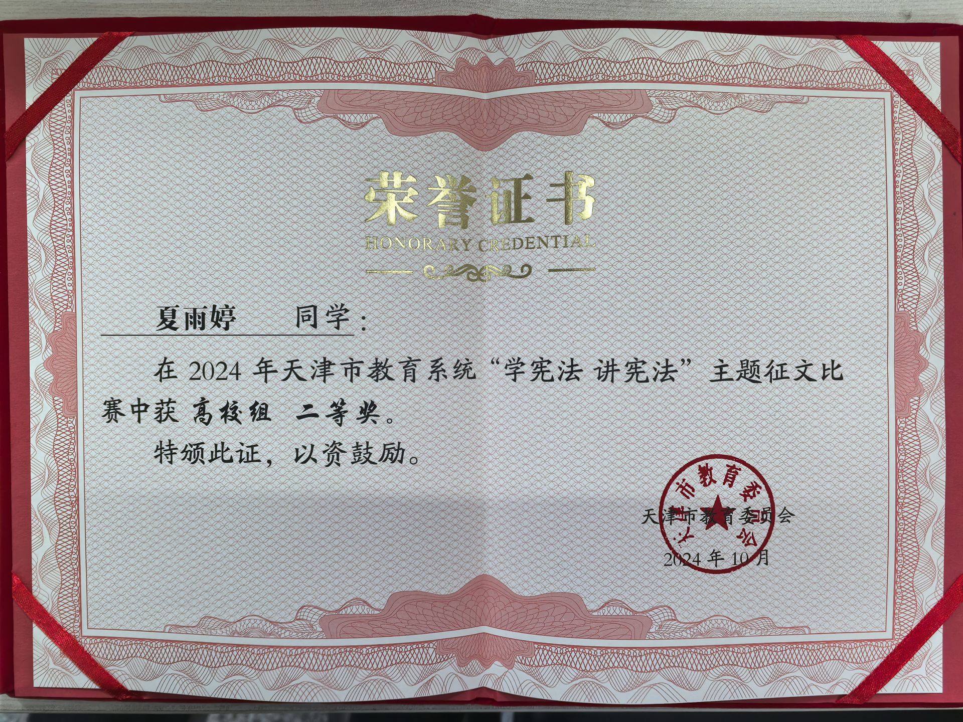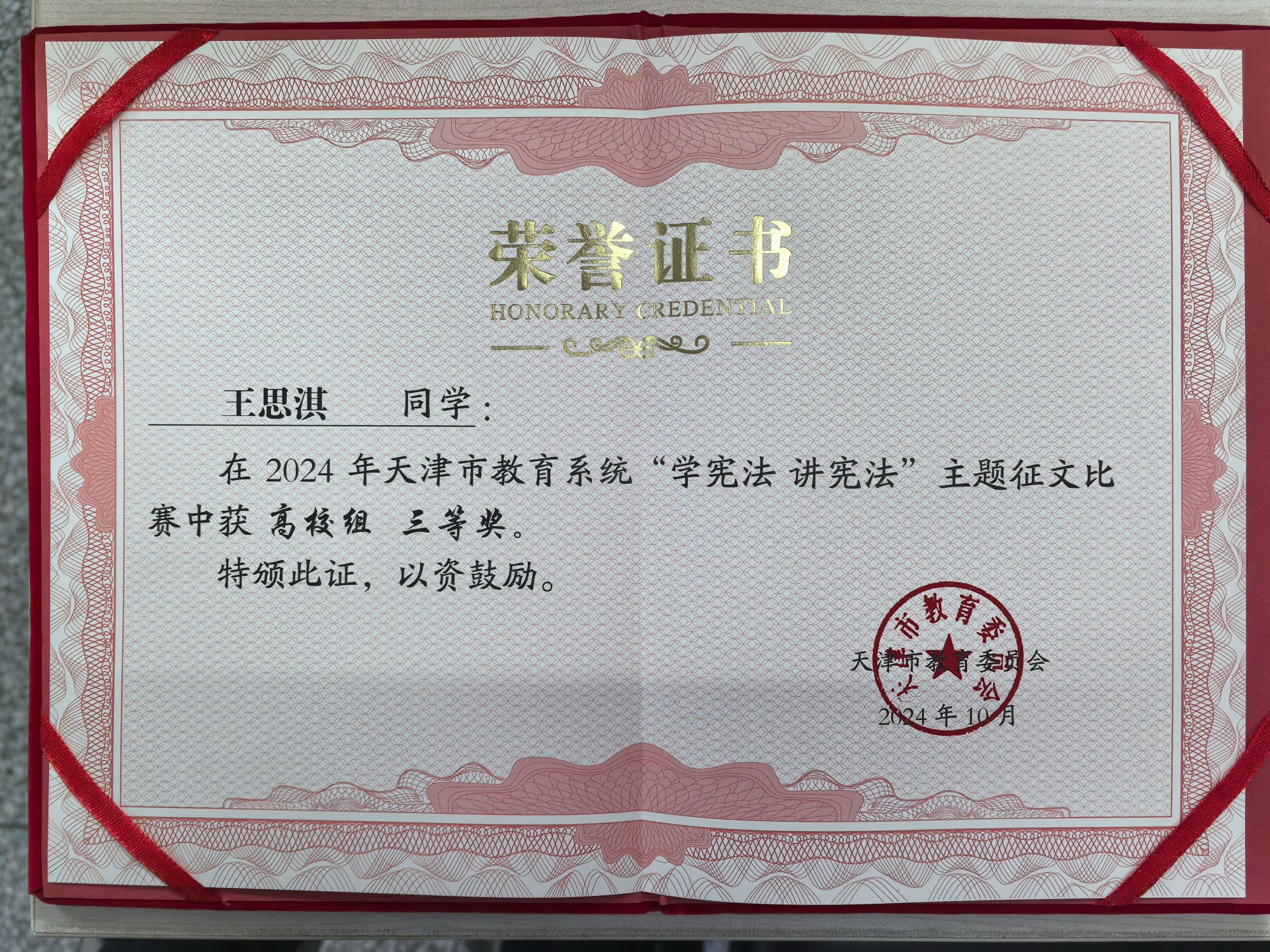 近日,天津市教育委员会公布了天津市教育系统2024年“学宪法 讲宪法”主题征文比赛获奖名单。法学院法学2305班学生夏雨婷、王思淇分别斩获二等奖、三等奖。