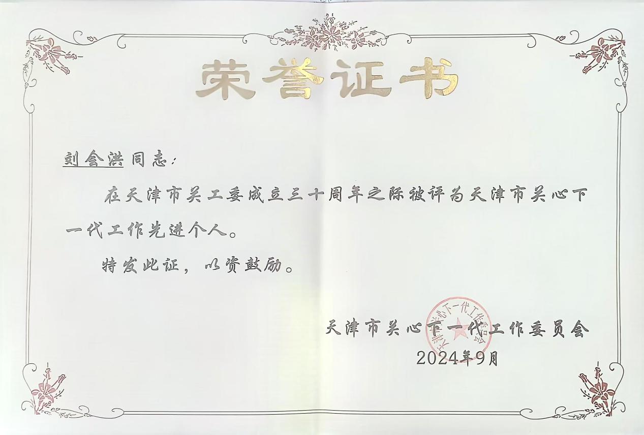 近日,天津市关心下一代工作委员会下发了《关于表彰天津市关心下一代工作先进集体、先进个人和突出贡献奖的决定》,星空关工委秘书长刘会洪老师获得“天津市关心下一代工作先进个人”荣誉称号。
