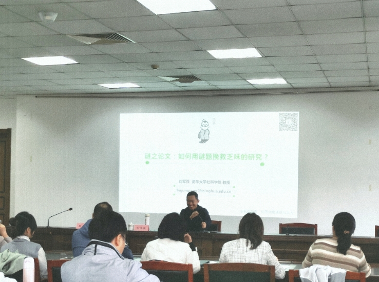 报告会上,刘军强教授围绕“研究问题合理化的三种方式”“酒吧凳子为什么那么高?”“Puzzle bank”展开,对“寻找空白、现实问题或理论驱动、方法改进”三种方式进行了说明,基于自己论文撰写、发表及审稿经历对“Puzzle bank”进行了生动详细的讲解。刘军强教授还向大家介绍了一些经典书籍,以便老师和学生更好地发现研究空白,提高论文写作水平和技巧。与会老师及学生围绕如何发现研究空白,如何判断一个问题是一个好问题,如何保证研究的原创性、增强文章的故事性等方面了进行提问互动。