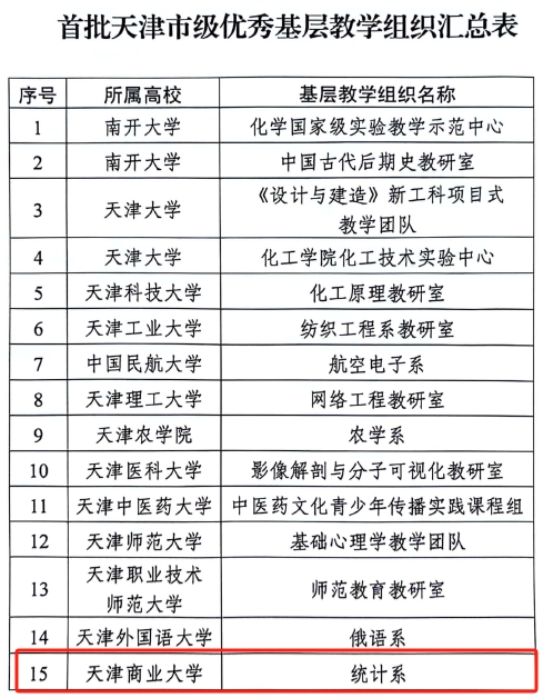 近日,市教委公布了首批天津市级普通高校优秀基层教学组织评选结果,共评选出25个市级优秀基层教学组织,星空理学院统计系基层教学组织成功入围。