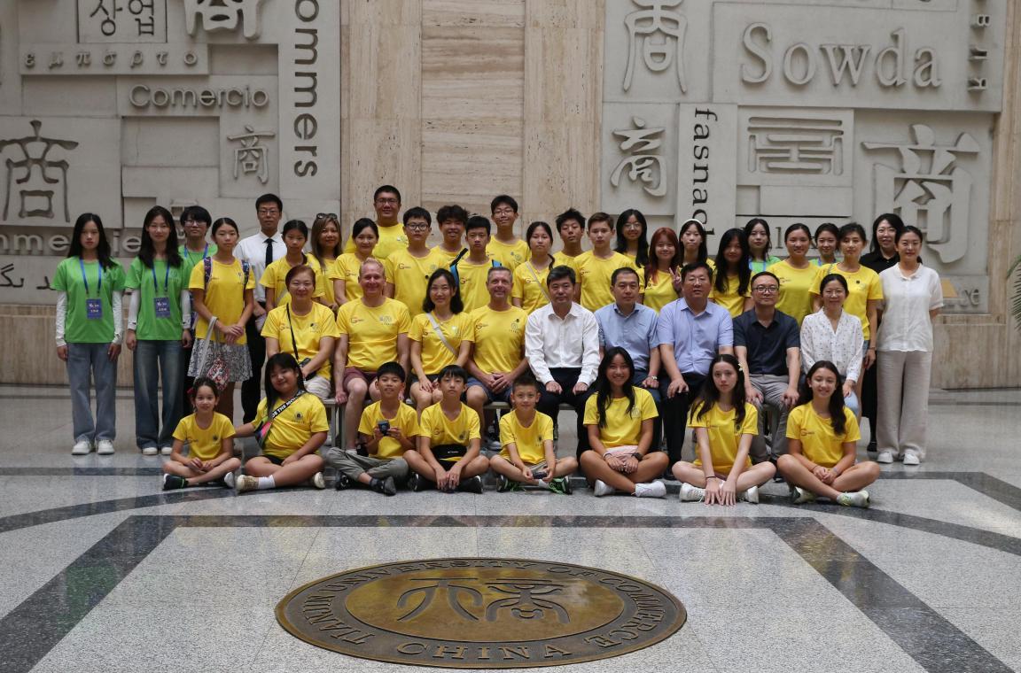 开营仪式结束后,团组成员到图书馆二楼“商”字墙前合影留念,随后组织成员参加了中国书法文化体验课程。