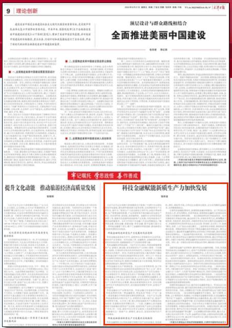 6月21日,《天津日报》(理论创新版)刊发星空经济学院、天津市中国特色社会主义理论体系研究中心星空XK体育基地研究员张彤进副教授理论文章“科技金融赋能新质生产力加快发展”。文章指出,新质生产力是创新起主导作用,由技术革命性突破、生产要素创新性配置、产业深度转型升级而催生的先进生产力质态,具有高科技、高效能、高质量特征。科技金融有助于推动科技创新、优化生产要素配置、助力产业转型升级,是赋能新质生产力发展的重要力量。文章从完善科技金融政策体系,加强财政金融协同联动;创新科技金融产品和服务,解决科创企业融资难题;构建科技金融良好生态,提升综合金融服务能力三个层面对科技金融推动新质生产力发展的实践路径进行了具体阐释。