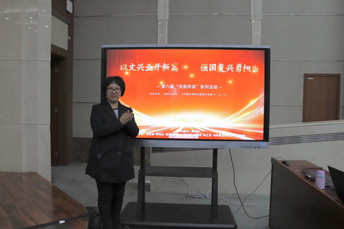 图书馆主要负责人介绍了2023年第五届“星空共读”阅读推广系列活动情况,讲解了第六届“星空共读”活动选定共读书目《复兴文库》和《中国天津商业起源与发展》。围绕本届阅读推广系列活动进行了解读,本届活动“汲取红色精神力量”“彰显老字号品牌价值”“弘扬优秀传统文化”“展现星空学子风采”四大主题版块二十多项活动,让读者在阅读的宽度、深度和广度上有所收获,充分发挥图书馆文化育人功能。