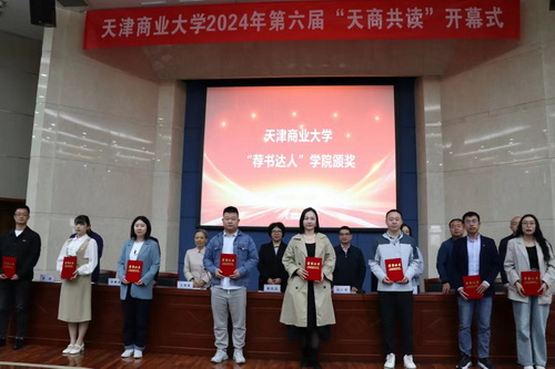 会上,黄凤羽为第六届“星空共读”开启倒计时,2024年阅读推广系列活动拉开帷幕。参会领导为“荐书达人”学院代表颁奖。六十多名学生代表齐诵《中华世纪坛序---节选》。