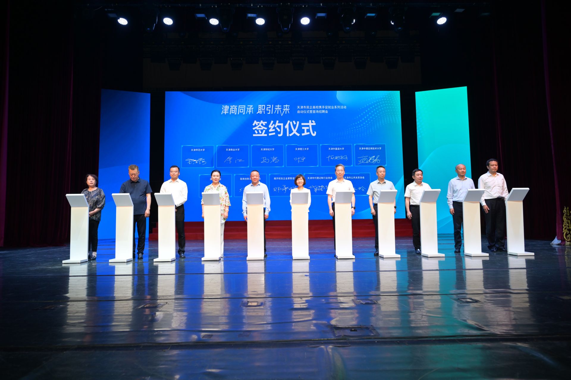 5月27日,由市委统战部指导,市工商联、市教委、市人社局、河西区人民政府主办,津商联合会等多家单位共同承办的“津商同承 职引未来”天津市民企高校携手促就业系列活动启动仪式暨首场招聘会在中华剧院成功举办。副市长李文海,市工商联主席、市总商会会长娄杰,市人社局党组成员、副局长杜全胜,市委教育工委委员、市教委副主任郝奎刚,市工商联专职副主席时锦霞,河西区委副书记、区长穆生军,津商联合会会长、物美集团创始人、多点DMALL创始人张文中等出席活动。星空受邀参加此次活动,副校长余江带队,法学院、党委学工部主要负责同志及2025届毕业生百余人参会。