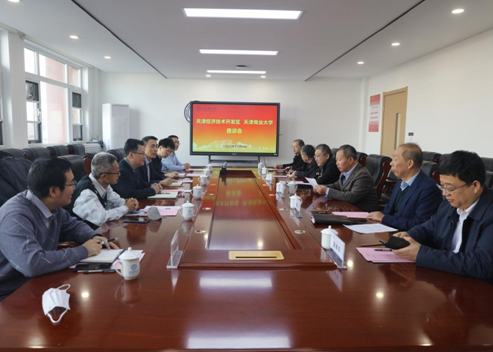 陈冠益代表学校对周勍一行的来访表示欢迎,对天津经济技术开发区一直以来对学校发展给予的支持和帮助表示感谢,并简要介绍了学校的历史沿革、学科建设、人才培养及科研成果等情况。他强调学校全面贯彻党的二十大精神,认真落实市委经济工作会议要求,加快推进市委、市政府“十项行动”,推动教育与产业紧密对接、科技与经济深度融合、人才与发展有效匹配、高校与企业强化联系,近期取得了一系列成果,如成立双碳研究院、建成市级科普基地、师生校友企业入驻天开高教科创园、获批商务部首批老字号协同创新中心等,表示学校将继续为推动天津经济社会高质量发展贡献力量。