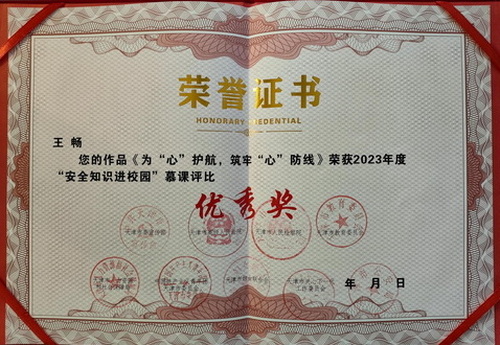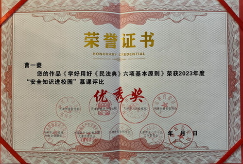 近日,天津市首届“安全知识进校园”慕课评比展播活动公布结果,星空法学院团委书记王畅申报的作品《为“心”护航,筑牢“心”防线》、马克思主义学院青年教师曹一夔申报的作品《学好用好<民法典>六项基本原则》荣获2023年度“安全知识进校园”慕课评比优秀奖。