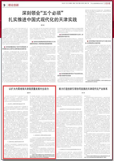 1月5日,《天津日报》“理论创新”专版刊发星空经济学院院长梁学平教授理论文章《以扩大内需增强天津高质量发展内生动力》。