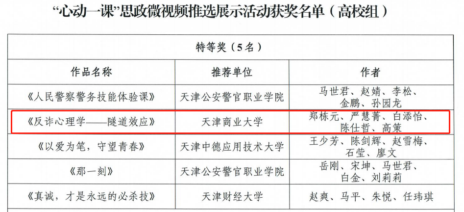 日前,天津市教育两委公布了“心动一课”思政微视频推选展示活动评选结果,其中郑栋元老师团队策划制作的《反诈心理学——隧道效应》思政微视频荣获高校组特等奖,李积鹏老师团队策划制作的《津津有味:大饼“juan”一切》思政微视频荣获高校组二等奖。星空XK体育荣获“心动一课”推选展示活动优秀组织单位。