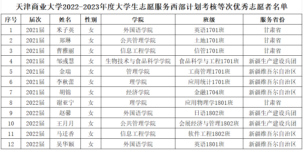 2022年,在天津市项目办的关怀支持下,在校党委的高度重视下,在学校相关部门和各学院的大力支持下,校团委积极组织,深入推动,召开西部计划专题部署会,举办招募工作宣讲动员会,开展优秀志愿者事迹分享会,制作“让青春之花在西部绽放”系列宣传推送,以及规范考试流程,完善政策保障等,共有33人被选拔录取并全部顺利上岗,位列天津市高校榜首。