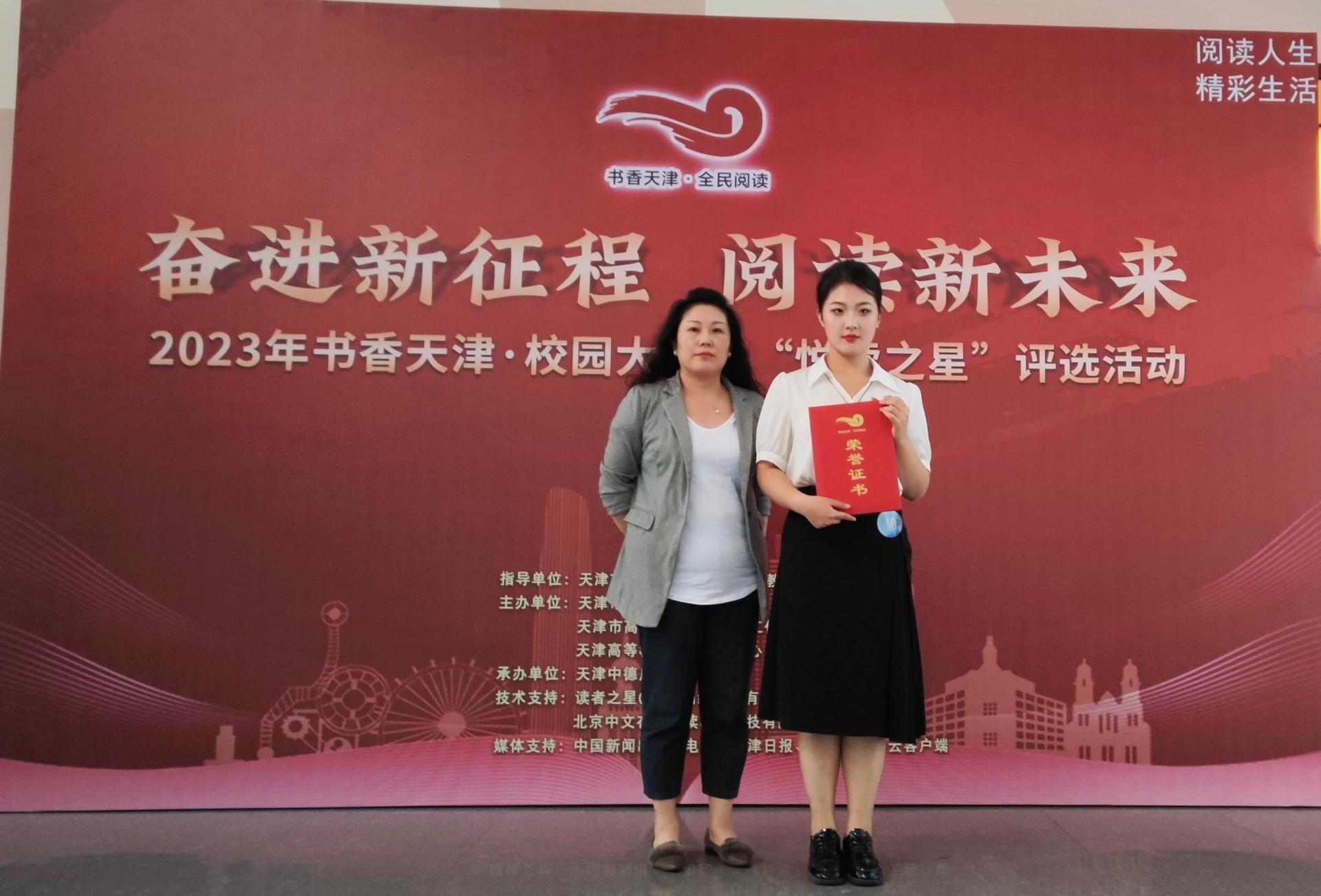 近日,由天津市新闻出版局、天津市教育委员会主办的2023书香天津·校园大学生“悦读之星”评选活动决赛在天津中德应用技术大学举行。星空外国语学院2021级邱雨涵同学代表星空参赛,荣获二等奖,公共管理学院的陶玟琪、艺术学院的马文娇、刘思雨3位同学获评市级网络人气奖。