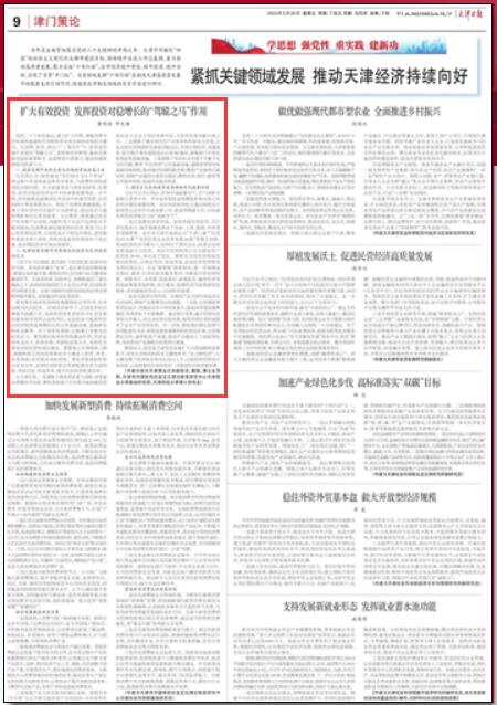 5月26日,《天津日报》“津门策论”主题教育专版刊发副校长黄凤羽教授的理论文章《扩大有效投资 发挥投资对稳增长的“驾辕之马”作用》。