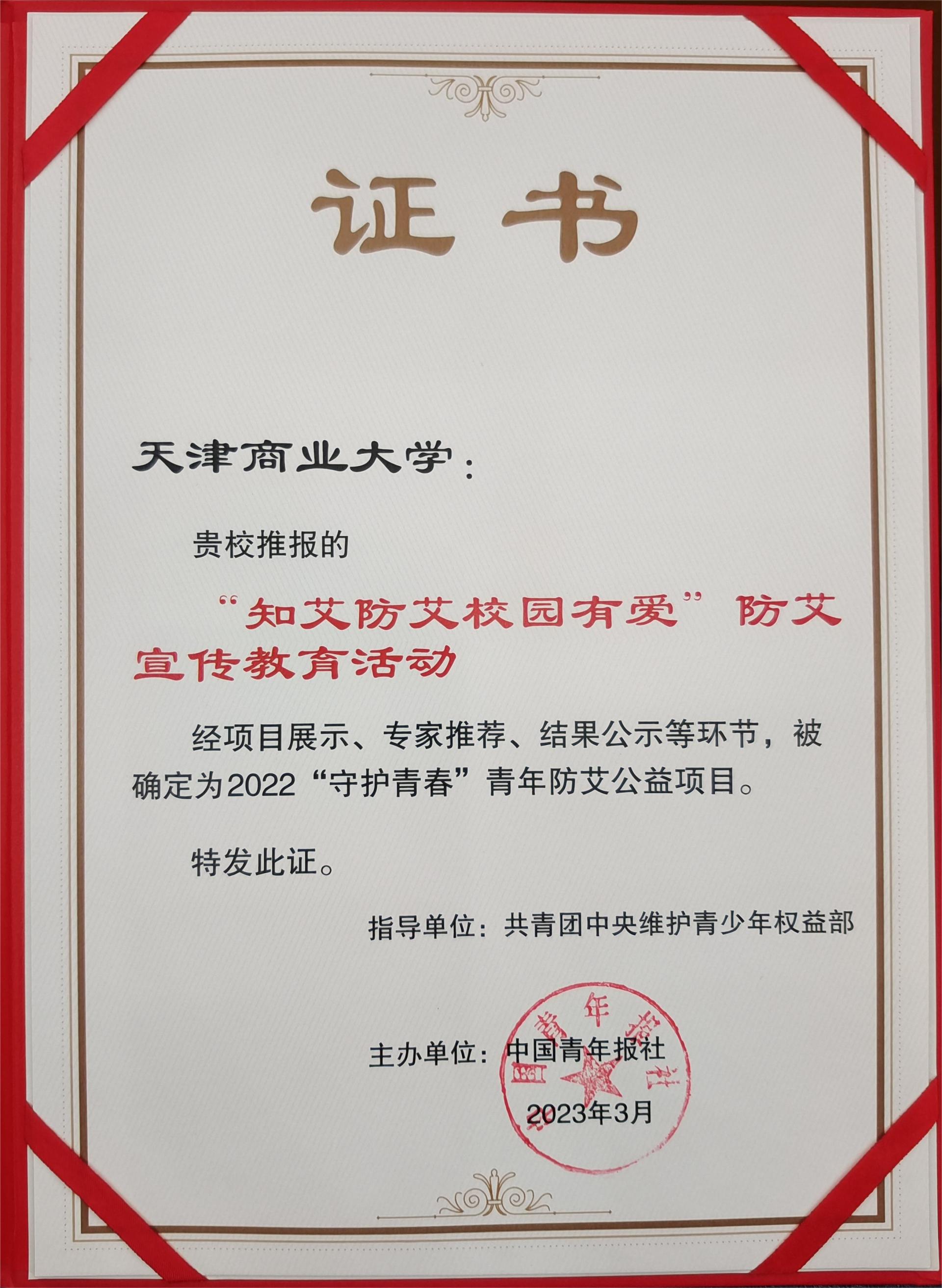 4月26日,由共青团中央维护青少年权益部指导,中国青年报社、北京青爱教育基金会主办的2023青年防艾工作研讨会在中国石油大学(北京)召开。会上为全国2022“守护青春”防艾公益项目进行颁奖,由星空团委指导、红十字会申报的“知艾防艾 校园有爱”项目成功入选,是天津市高校唯一入选项目。