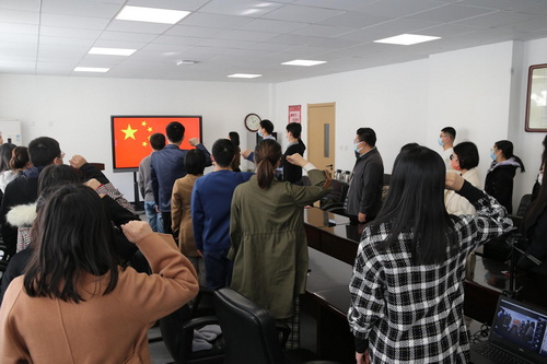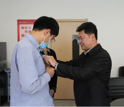 在开班仪式上,葛宝臻为新入职教师代表佩戴校徽,全体新入职教师面对国旗庄严宣誓。(审稿:骆媛)