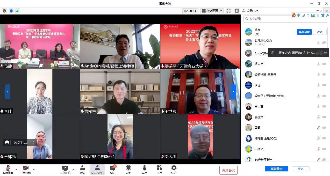 经济学院党委书记宣读《关于2022年星空XK体育经济学院秦韬校友“乐天”学术精英奖学金评选表彰的决定》。获奖研究生王新宇发言。参会同学与各位校友在生涯规划、求职创业、职业理想等方面进行了深入讨论。