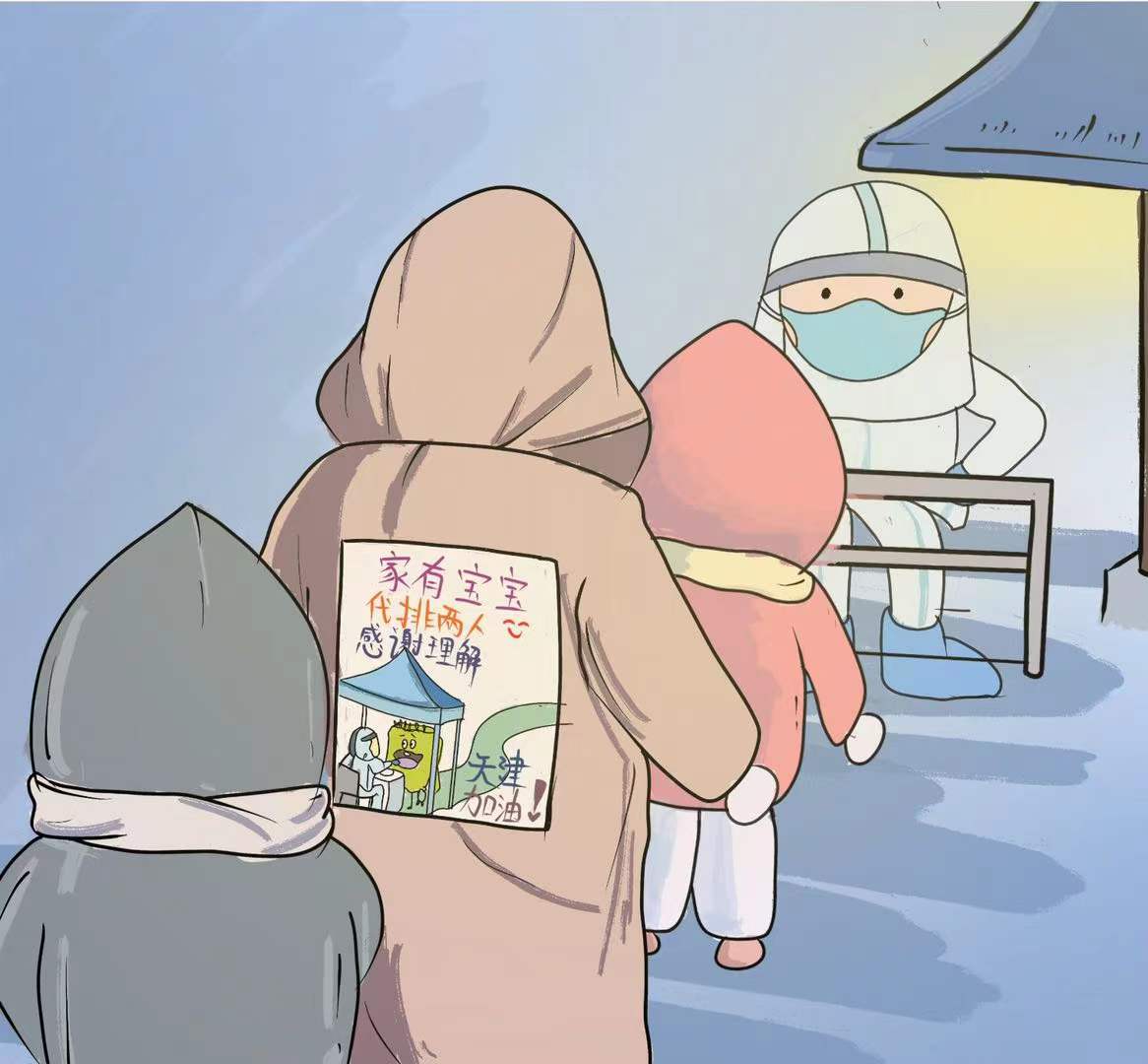 学生党员孙岳华、张瑞佳、常丽亚和积极分子杨雅萱共同创作完成《争分夺秒战疫情》《冬日送暖》《众志成城》《党员先锋岗》《全员核酸》《向暖而行》等12副插画作品,记录战“疫”每一帧。她们表示,虽然不能像白衣战士一样奔赴前线,但是作为新时代艺术类大学生,能做的是发挥一技之长,创作时代作品记录战“疫”实况,致敬所有一线工作人员,为天津加油。