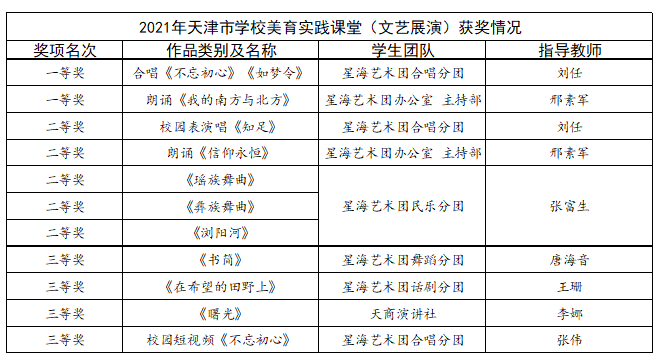 近日,由天津市教育委员会主办的天津市学校美育实践课堂(大学生文艺展演)获奖结果公布,星空选送的11个项目全部获奖。其中,合唱《不忘初心》《如梦令》、朗诵《我的南方与北方》荣获大学组一等奖;民乐演奏《瑶族舞曲》《彝族舞曲》《浏阳河》、校园表演唱《知足》、朗诵《信仰永恒》荣获大学组二等奖;舞蹈《书简》、话剧《在希望的田野上》、朗诵《曙光》、校园短视频《不忘初心》荣获大学组三等奖。