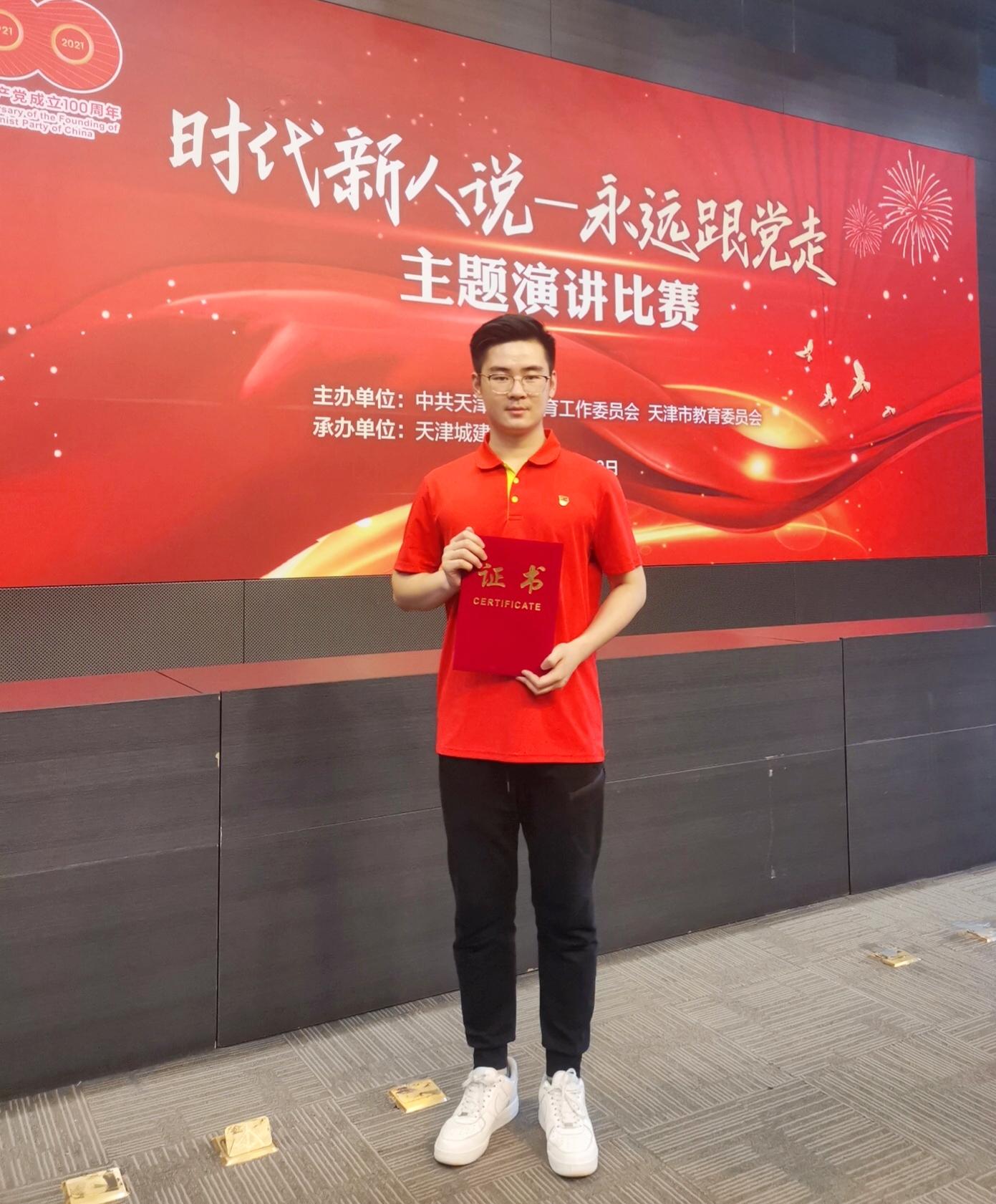 5月28日上午,天津市“时代新人说—永远跟党走”主题演讲比赛天津城建大学举办,星空马克思主义学院2019级研究生、天津市第四期青马工程学员王鹏飞荣获三等奖。