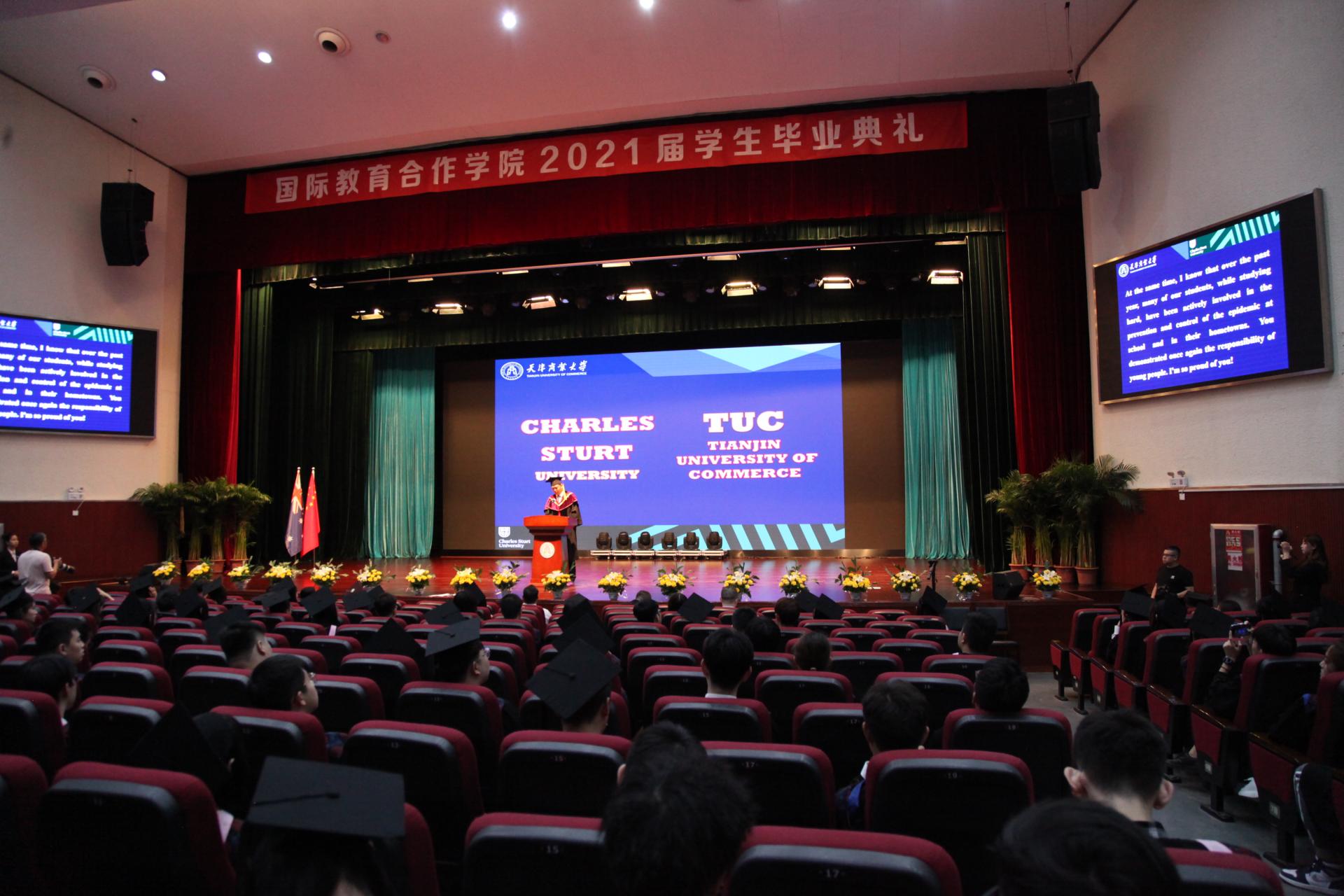 澳大利亚查理斯特大学校长John Germov教授、查理斯特大学工商管理学部院长Tracey教授通过视频的形式向毕业生送上祝福,表达了对2021届毕业生的美好祝愿,祝福所有毕业生在新的人生旅程中一切顺利,并希望两校的合作办学关系更加紧密。