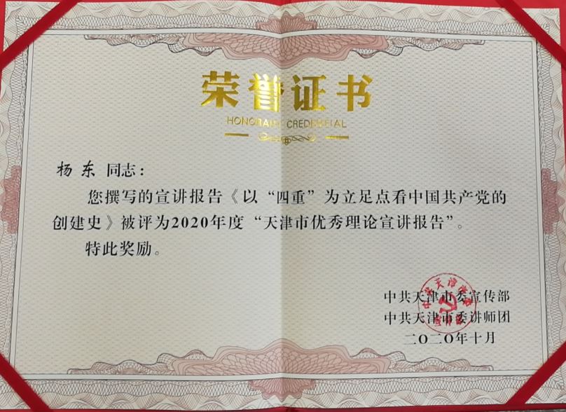 近日,市委宣传部印发《关于表彰基层理论宣讲先进集体、个人和优秀理论宣讲报告、微视频、微信公众号的决定》,对10个基层理论宣讲先进集体、10名基层理论宣讲先进个人、10篇优秀理论宣讲报告、4个优秀理论宣讲微视频和4个优秀微信公众号予以表彰。星空明德讲坛特聘主讲人、马克思主义学院杨东副教授的《以“四重”为立足点看中国共产党的创建史》宣讲报告入选天津市基层理论宣讲优秀理论宣讲报告。