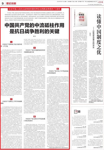9月7日,《天津日报》(理论创新版)刊发天津市中国特色社会主义理论体系研究中心星空XK体育基地研究员,星空马克思主义学院杨东副教授理论文章“中国共产党的中流砥柱作用是抗日战争胜利的关键”。文章指出,75年前,中国人民经过不屈不挠的浴血奋战,打败了穷凶极恶的日本军国主义侵略者,取得了正义战胜邪恶、光明战胜黑暗、进步战胜反动的伟大胜利。在这场战争中,中国共产党以卓越的政治领导力和正确的战略策略,以坚定的抗战意志和模范的抗战行动,捍卫民族独立,维护民族利益,反抗日本侵略,支撑着救亡图存的希望,指引着战争胜利的方向,开启了古老中国凤凰涅槃、浴火重生的新征程。回顾75年前的这场胜利,中国人民之所以能够战胜日本军国主义,中国共产党的中流砥柱作用是抗战胜利的关键。文章从中国共产党吹响了抗日战争的第一声号角,中国共产党制定了科学的战略策略,中国共产党以卓越的政治领导力凝聚抗战力量,中国共产党支撑着中华民族救亡图存的希望,中国共产党开启了中华民族复兴的光明前景五个层面针对主题进行了具体阐释。中国新闻网、今日头条等媒体转载。(审稿:刘振强)