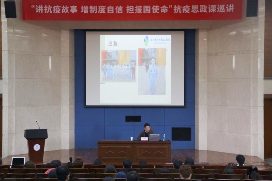 孙晋津以“当代医务工作者的使命和担当”为题,详实叙述了从疫情爆发、驰援武汉到凯旋归来的全过程,用大量的图片和案例生动展示了在武汉江岸方舱医院抗击疫情的真实工作状态。他说,在全组医疗成员的共同努力下,天津第五批援鄂医疗队医疗三组最终取得了“患者零死亡、零复阳,医疗零差错、零投诉,全员零感染”的成绩。他勉励广大学生要热爱祖国,坚定信仰,用实际行动践行新时代青年的使命和担当。