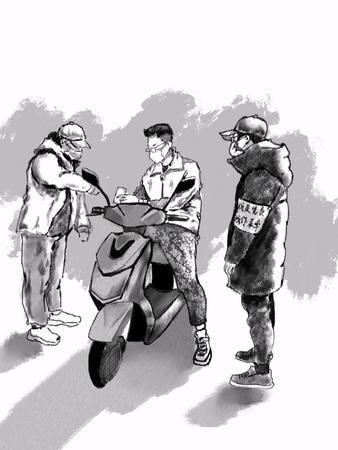 志愿服务期间,她还参与了防疫宣传工作,和其他大学生志愿者一起在小区内进行巡查和宣传,警示大家疫情未退,不要放松警惕。志愿服务过程中,工作人员辛苦忙碌的身影也深深映在赵璐炜脑海中,她想到用自己的绘画特长记录描绘志愿者最美的工作瞬间。简笔素色,勾勒出抗疫战线中最动人的景象。这其中有志愿者张贴宣传海报的身影,有他们拿着消毒器四处消毒的背影,也有他们冒雨工作的场景。“我从拍摄的照片里选了日常突出的,把他们画出来,希望大家能看到他们每天的工作。”赵璐炜如是说。