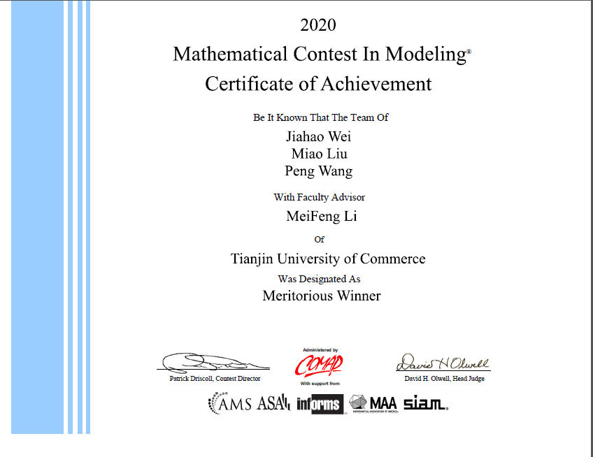 近日,美国大学生数学建模竞赛组委会公布了2020年美国大学生数学建模竞赛结果,由理学院教师李美凤指导,数学与应用数学1701班魏家濠、统计学1701班刘淼、自动化1701班王鹏组成的代表队,荣获美国大学生数学建模竞赛M奖(一等奖);由理学院教师耿峤峙指导,数学与应用数学1701班李炎、信息与计算科学1701班张湑行、经济学1701班李萌欣组成的代表队,荣获美国大学生数学建模竞赛H奖(二等奖)。本次大赛,共有来自多个国家的两万多支队伍参赛,获得M奖的概率仅为6%左右。