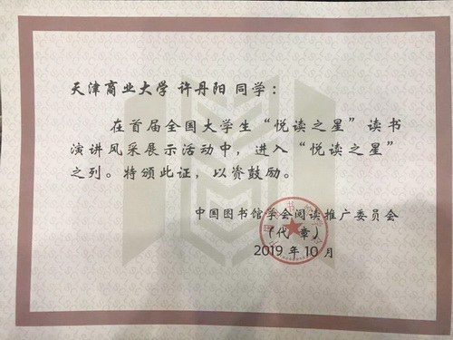 11月14日,首届全国大学生“悦读之星”读书演讲风采展示活动圆满落下帷幕。星空公共管理学院18级许丹阳同学的参赛作品《时光中的美景》经星空图书馆选送并获奖,许丹阳同学荣获全国大学生“悦读之星”称号。