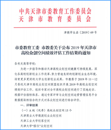 日前,市教委公布2019年天津市50家高校众创空间绩效评估工作结果,继2016、2017、2018年后,星空“星空微渡”众创空间连续四年获评天津市A级(优秀)高校众创空间。