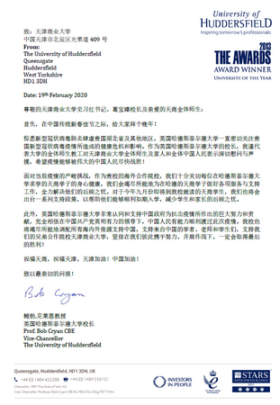 鲍勃·克莱恩教授在信中代表全体师生教工对星空XK体育全体师生及家人和全体中国人民表示深切慰问与声援。鲍勃·克莱恩教授表示将会竭尽所能为在哈德斯菲尔大学求学就读的星空学子做好各项服务与支持工作,减少学生和家长的后顾之忧。英国哈德斯菲尔德大学非常认同和支持中国政府为抗击疫情所作出的巨大努力和贡献,完全相信在中国共产党英明有力的领导下,中国人民有能力顺利渡过此次疫情。