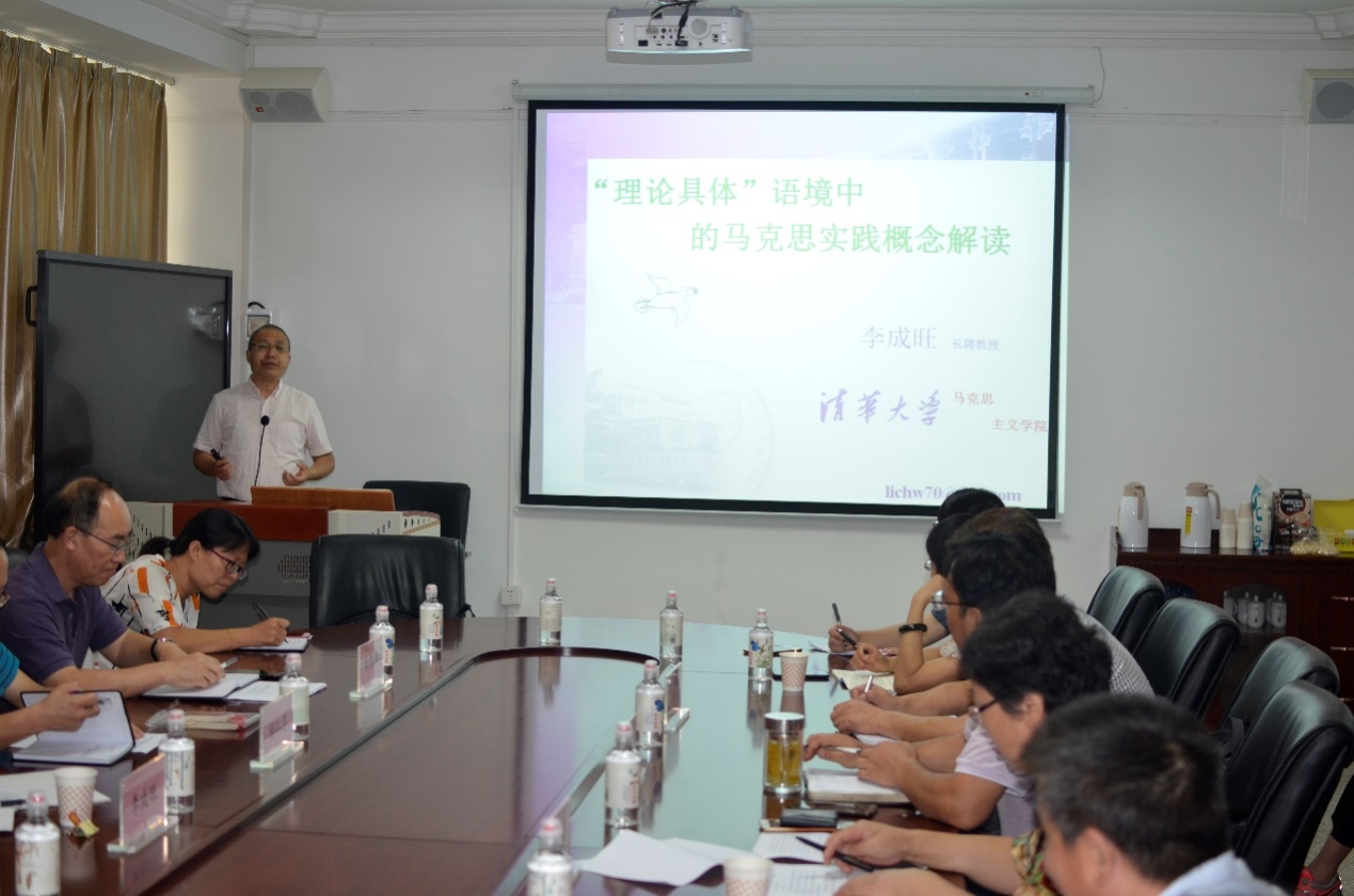 第一阶段由清华大学长聘教授、马克思主义学院博士生导师李成旺教授做了题为“‘理论具体’语境中的马克思实践概念解读”专题报告,李教授梳理了古代以来的西方哲学思想,把它们概括为“逻辑在先”思维模式,而马克思思想与之最大的区别就在于坚持逻辑的与历史的相统一原则,坚持从人类社会的物质生产实践出发去理解人类社会自身的历史,从而克服了旧思维模式的唯心主义局限性,创立了自己的历史唯物主义。