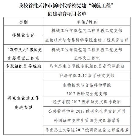 近日,天津市委教育工委市教委下发了《关于公布首批新时代天津市各级各类学校党建“领航工程”创建培育单位名单的通知》(津教党办〔2019〕58号),经资格审查、处室推荐、专家评选、集中审议、结果公示等环节,星空机械工程学院包装工程系教工党支部等10个党组织和党员获批天津市党建工作各级各类创建培育单位和个人。