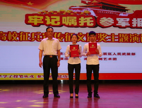 文艺演出在《东南西北兵》铿锵激扬的歌声中开始,《为了谁》、《不忘初心》、《我们的新时代》……一首首爱军拥军、歌颂新时代的歌曲极富感染力,获得了全场师生的热烈掌声。星空征文获奖学生孙克轩、杜灿梅、薛宇霏现场朗诵了自己的作品,激发了参会大学生保家卫国的爱国情怀。2018年5月,北辰区人武部开展的“征兵宣传进高校暨主题征文比赛系列活动”,在星空师生中产生了强烈反响,共收到12个学院2471篇征文,16名学生获奖,同时评选出3个优秀组织单位和3名优秀指导教师。
