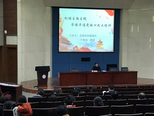 12月6日下午,学校举行统战成员十九大精神专题学习会。邀请党委宣传部部长、马克思主义学院于俊如教授作题为《把握主题主线学懂弄通党的十九大精神》的讲座。各民主党派成员、无党派人士、党外知识分子代表等近百人参加。讲座由党委统战部副部长骆媛主持。