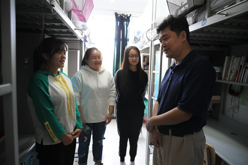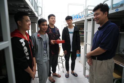 “同学们,中秋快乐!”葛宝臻一行先后来到41号、10号、7号和4号学生宿舍楼,每到一处都给学生送上节日问候,与学生亲切交谈,详细询问学生在学习、饮食、住宿和安全等方面的问题,特别是新生入学以来对大学生活、学习的适应情况。听说校领导和老师们前来看望,同学们开心地围拢过来,你一言我一语地回答着,并表示一定会以饱满积极的态度迎接自己的大学生活,不辜负学校和父母的期望。葛宝臻校长殷切叮嘱学生一定要注意外出安全,给家里送上节日祝福,让家人放心,鼓励学生们珍惜大学时光,尽快转换角色,融入大学生活,树立远大理想,实现新的梦想。