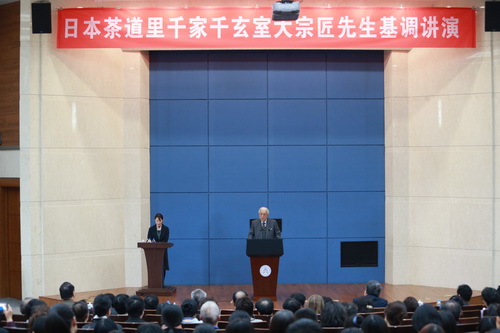 会谈后,千玄室大宗匠为来宾和星空外国语学院日语专业的师生作了题为“文化之重”的基调讲演。葛宝臻校长在基调讲演前致词,他回顾了茶道里千家与星空的交往历史,高度赞扬了千玄室大宗匠先生为中日友好与文化交流所做的贡献,赞扬他“不仅培养了一批日本茶道的爱好者和传播者,更重要的是培养了一大批中日友好的践行者和文化交流的使者,加深了两国人民的相互了解和友谊, 推动了两国民间的教育文化交流”。