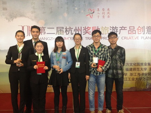 12 月 27 日 至 28 日,外国语学院教师郭金英率2013 级卓越会展实验班的两个团队赴杭州参加2014 第二届杭州奖励旅游产品创意策划大赛(全国邀请赛)决赛。大赛由杭州市旅游委员会主办,杭州师范大学、杭州市会议与奖励旅游业协会和杭州东方文化园旅业集团联合承办,来自上海、广州、海南、西安,天津等地的 20 多个高校团队参加了决赛。
