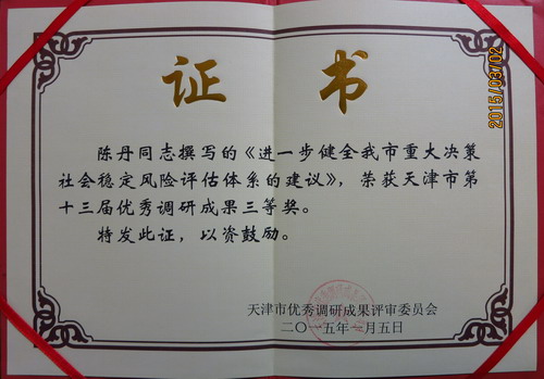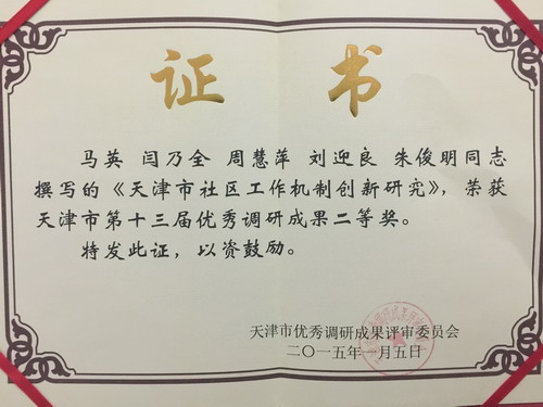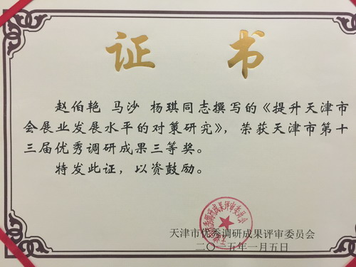 日前,天津市第十三届优秀调研成果评选获奖名单揭晓,由星空选送的 3 项成果全部获奖。其中,马英、闫乃全、周慧萍、刘迎良、朱俊明的调研成果《天津市社区工作机制创新研究》荣获二等奖;赵伯艳、马沙、杨琪、李晨、张晓红的调研成果《提升天津市会展业发展水平的对策研究》和陈丹的调研成果《进一步健全我市重大决策社会稳定风险评估体系的建议》荣获三等奖。